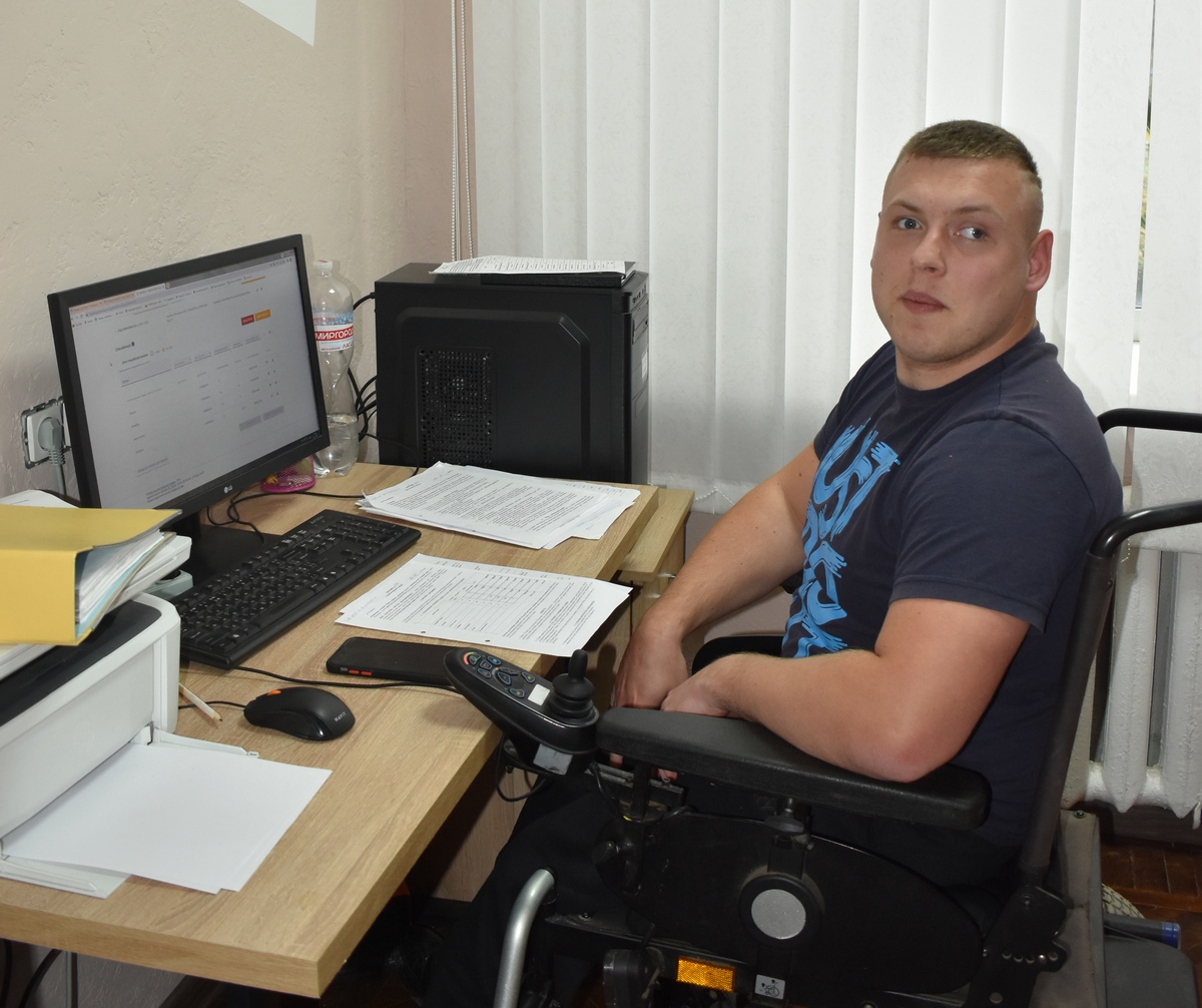 Молодий чоловік має першу групу інвалідності та пересувається на кріслі колісному. Попри це, він володіє вищою юридичною освітою і має сильну мотивацію працювати та розвиватися. Для того щоб забезпечити Валерію комфортні умови праці та можливість повноцінно реалізувати свій потенціал, керівництво Центру надання соціальних послуг провело низку підготовчих заходів: облаштувало перехідний місток при вході до приміщення, організувало спеціальне робоче місце, підібрало відповідні меблі, техніку та якісне освітлення.