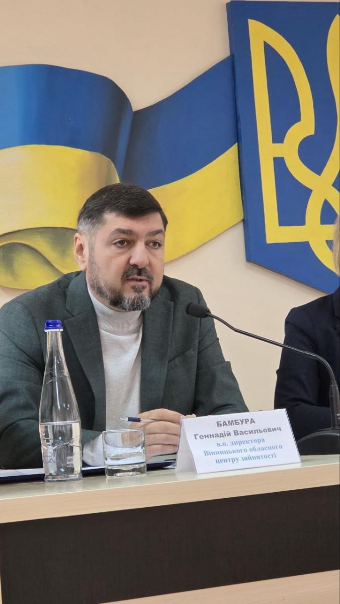 Службу зайнятості регіону представляв директор Вінницького обласного центру зайнятості Геннадій Бамбура. У своєму виступі він окреслив результати діяльності Жмеринської філії щодо надання послуг внутрішньо переміщеним особам у січні–вересні 2025 року.