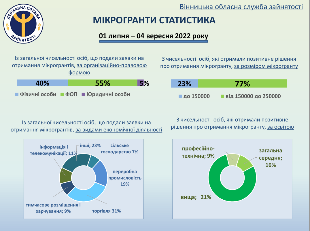 Станом на 23 вересня 2022 року Державним центром зайнятості прийнято 66 позитивних рішень щодо надання мікрогрантів заявникам Вінниччини на суму 14,7 млн. грн. Відповідно до умов програми, отримувачі мікрогрантів найближчим часом створять близько 170 нових робочих місць.