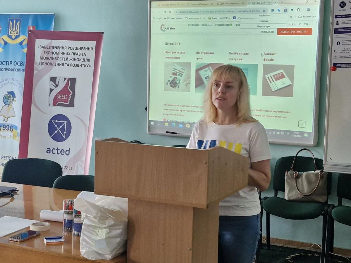 Захід відвідали переселенки, безробітні, ветеранки та члени сімей ветеранів, громадських організацій. Усі вони отримали практичні поради, як підготуватися до подачі заявки на грант, зрозуміти специфіку роботи з українськими і міжнародними фондами, дізнатися про лайфхаки щодо отримання грантів.