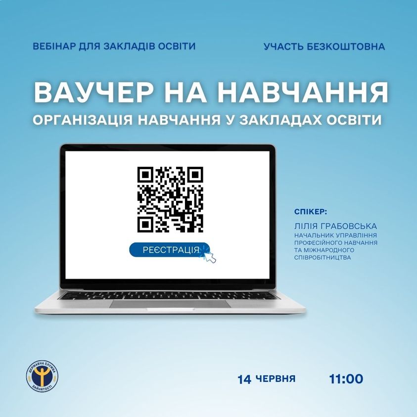Враховуючи останні зміни в законодавстві у сфері професійного навчання, розширення переліку професій та спеціальностей, спрощення процедури отримання ваучеру, Державна служба зайнятості проводить вебінар на тему "Ваучер на навчання: організація навчання у закладах освіти". До участі в заході запрошуються представники закладів професійно-технічної, фахової передвищої та вищої освіти.